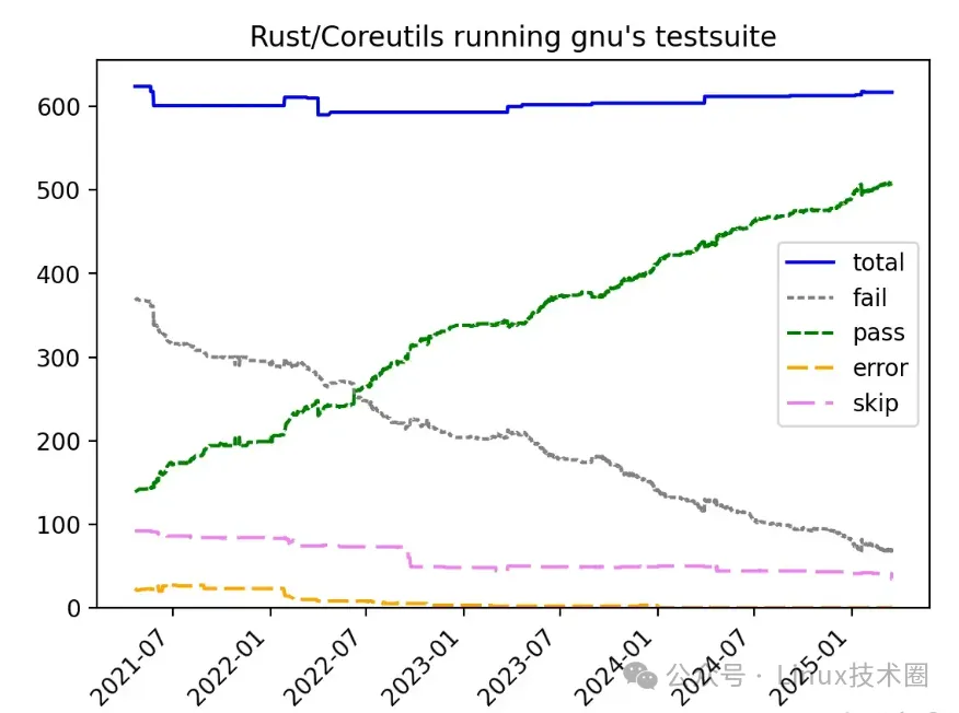从 Rust 使用者/爱好者的角度来说是个巨大的利好,因为 Ubuntu 下场有望促进 uutils 项目和相关依赖的迅速迭代。不过就目前 uutils 项目的完成度来看,25.10 是否能引入还是需要打一个大问号的。目前来看,虽然进展整体不错,但还是有不少测例是skip和fail状态的。