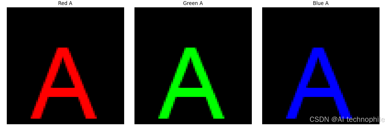 用 (255,0,0) 向量替换 255 值可以得到红色 A,(0,255,0) 得到绿色 A,(0,0,255) 得到蓝色 A。