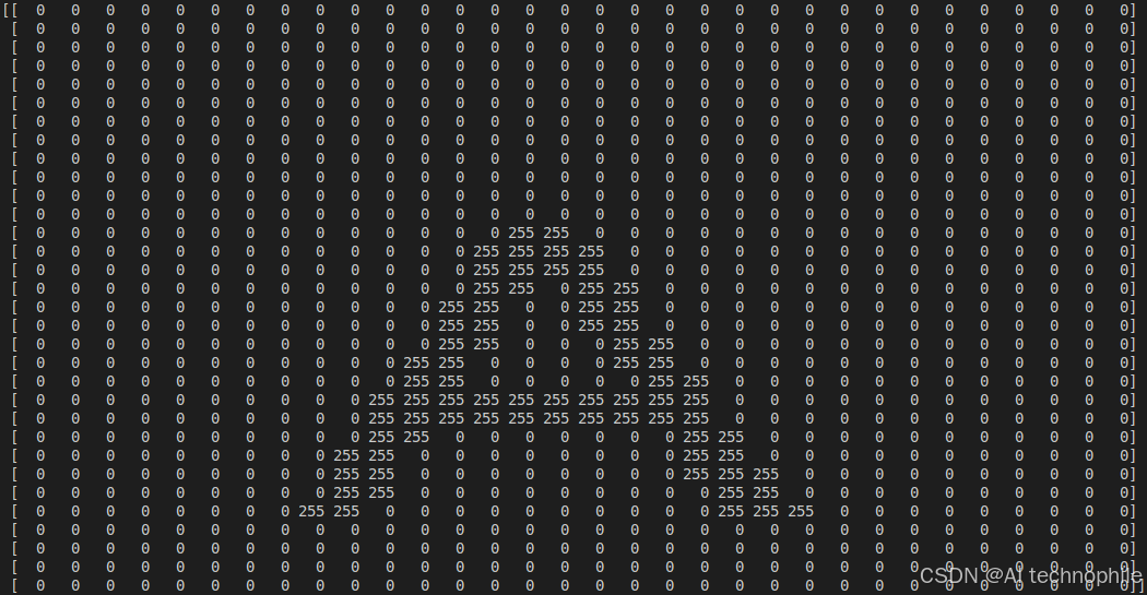 为了更好的理解像素和色彩空间,结合这两种概念创建图像。下示 32x32 的 2D 整数矩阵可以渲染为字母 A: