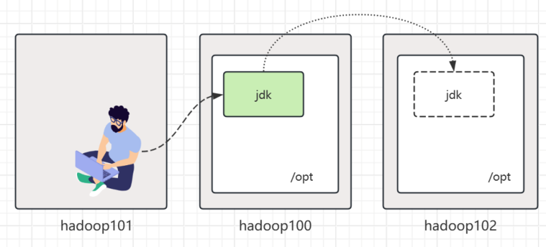 现在的目标是:要把hadoop100上的jdk文件夹拷贝到hadoop101中的相同的目录下。