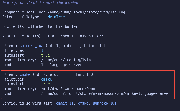🔍 可以用 :LspInfo 检查 cmake LSP 是否启动成功。打开 CMakeLists.txt,执行: