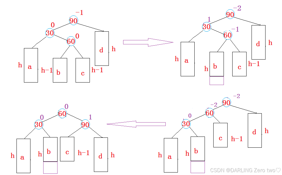 双旋的重点是平衡节点的调整,根据多个例子可以知道,主要是看 curleft 节点的平衡因子