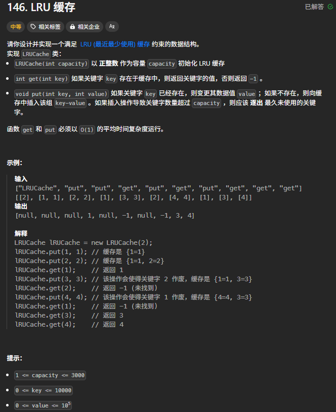 这道题主要是需要自己额外定义数据结构和函数,需要定义节点结构体,用于存放键值对,每个节点都有前后指针,所以这道题是采用哈希表+双向链表的做法来做的。这道题添加和删除节点的逻辑都很好理解,最难想到的就是当插入节点,但缓存已满时,如何找到最久未使用的节点,这个实现起来不难,每一次插入节点都从头部插入,不常使用的节点总是在链表的最末端,所以我们只需要将末端的节点删除即可。