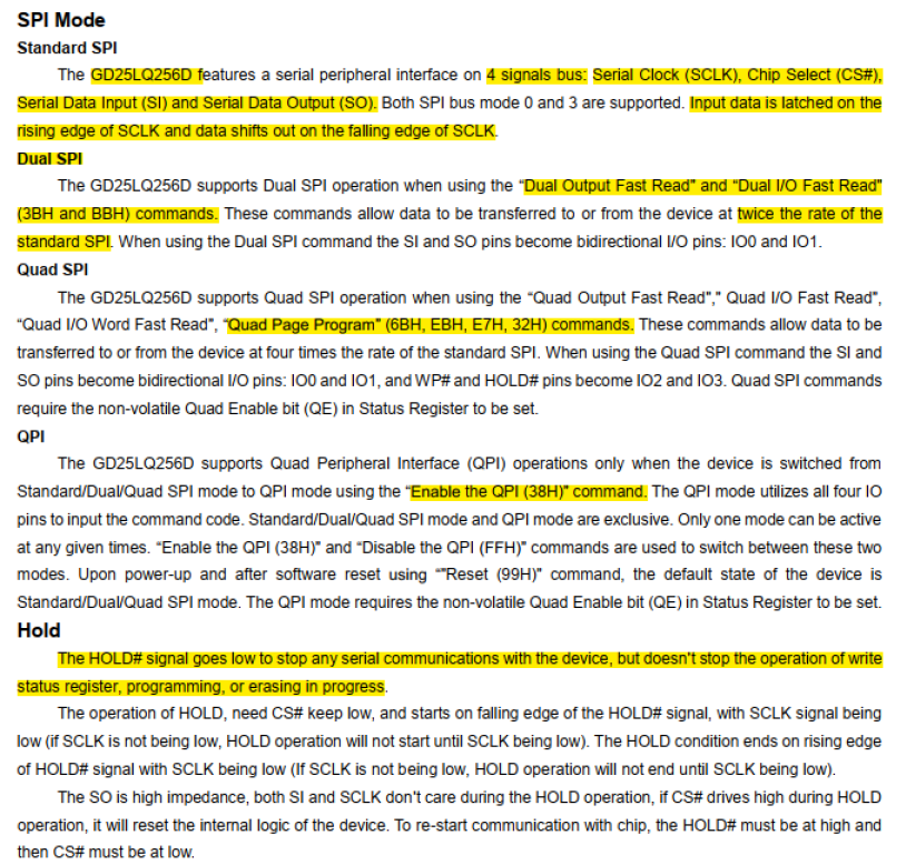 GD25LQ256D支持标准SPI协议,双线SPI(Dual SPI)协议与四线SPI(Quad SPI)协议。标准的SPI协议在串行时钟信号(SCLK)的上升沿把串行输入信号SI上的数据存入QSPI Flash中,在串行时钟信号(SCLK)的下降沿把QSPI Flash中的数据串行化通过单向的SO引脚输出。而在Dual SPI与Quad SPI中,SI与SO均为双向信号(既可以作为输入,也可以作为输出)。