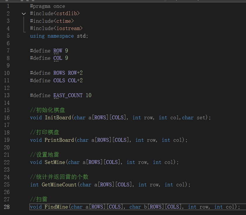 以上代码是扫雷游戏开发。代码包含常用库引入及标准命名空间使用声明。通过宏定义设置棋盘行列及雷数等参数。还声明了一系列函数,涵盖棋盘初始化、打印、布雷、统计雷数以及扫雷等功能,为实现完整扫雷游戏逻辑搭建了基本框架。