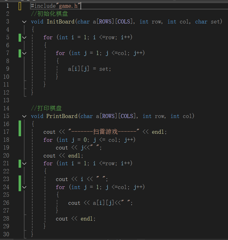 实现扫雷游戏中棋盘初始化和打印功能。 InitBoard 函数通过双重循环,将指定字符填充到棋盘二维数组对应位置,完成初始化。 PrintBoard 函数先输出游戏标题,再用循环按行列格式打印棋盘元素,同时打印行列索引,方便玩家查看,为游戏交互提供基础展示。