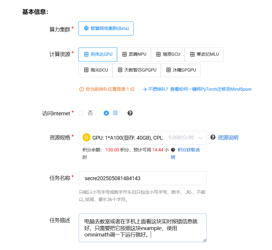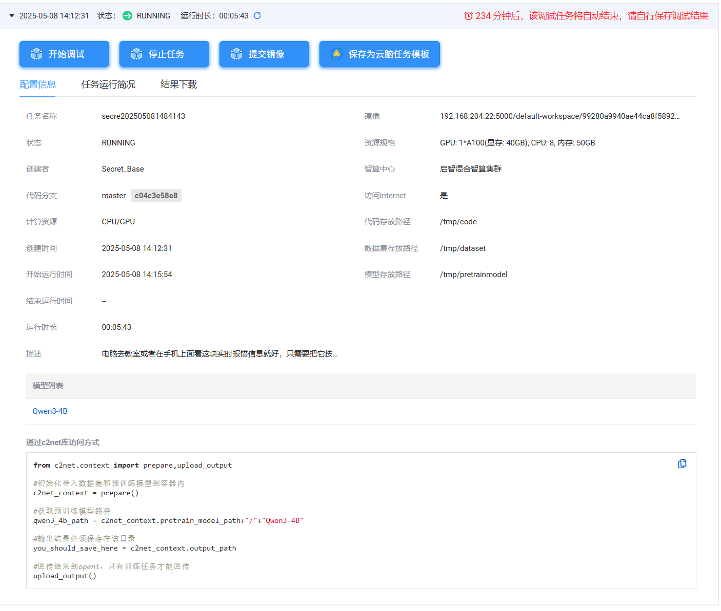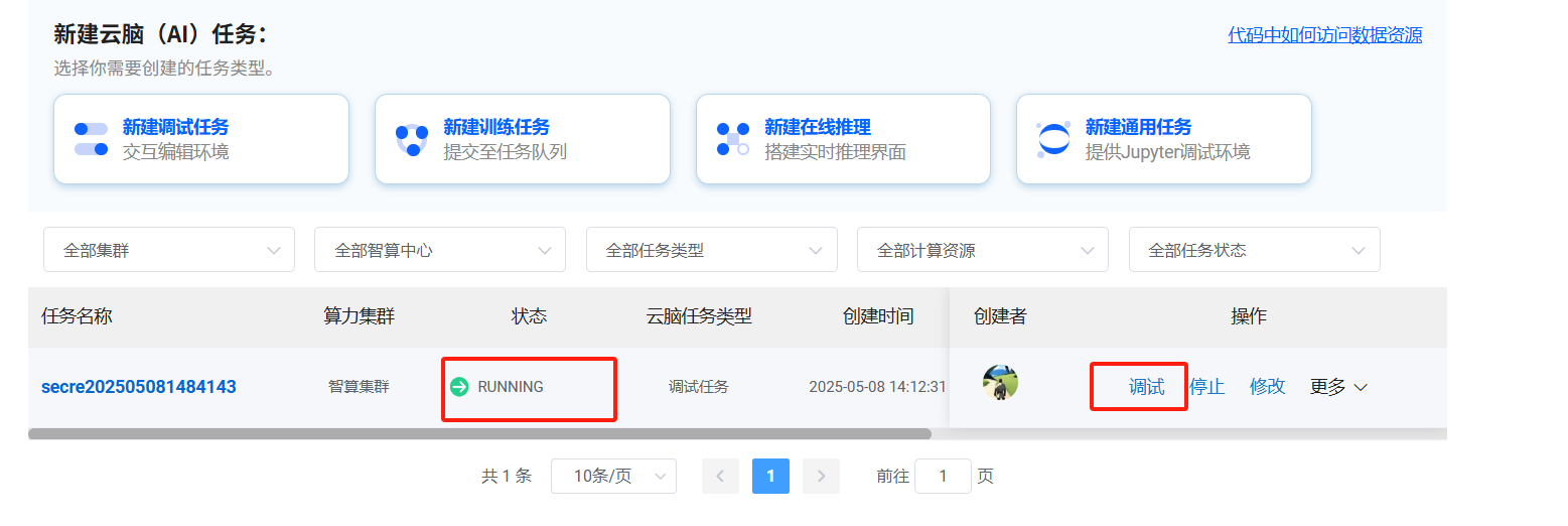 以上设置完成后,我们点击新建任务。等待服务器创建和分配资源。 资源分配完成后我们看到如下列表,看到资源running状态,后面有一个调试按钮,后面就可以进入代码调试窗体界面了。