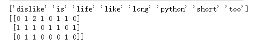 输出结果:比如,第一行表示第一个样本中各个词出现的次数,单个字符不统计