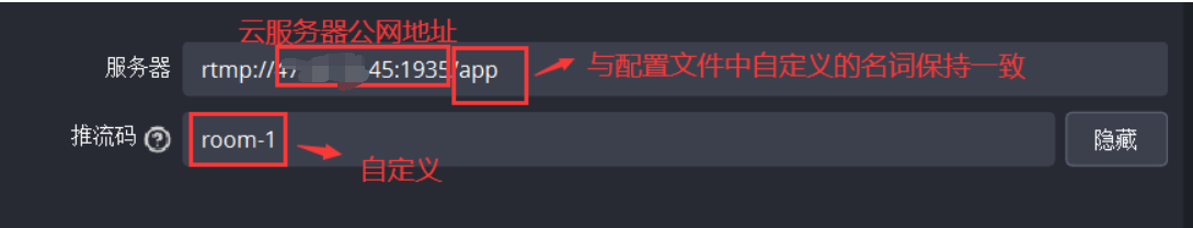 6.1 rtmp拉流地址为:rtmp://${服务器公网地址}:80/app/room-1