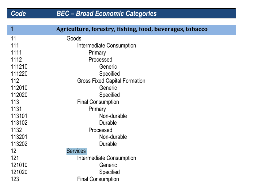 1.怎么区分中间品、消费品,资本品:EBC Rev.5 是根据商品和服务最终使用用途进行分类的标准,该版本共分为8大类,每一大类中分为商品(Goods)和服务(Services)。以第一大类农业为主的这一大类中的111210为例,表示的意思就是"农业 商品 中间消耗 Processed Generic"的意思。所谓的中间品就是指序号中第2、3为11的商品,资本品就是序号中第2、3为12的商品,当然消费品就是第2、3为13的商品。(就是这么简单明了,但就是这么简单甚至没有一个人愿意说明,老是叫人去看谁谁谁的文章,哎,都2014年十年前的文章了还让人去看,恶不恶心啊?...点名什么什么之家的那个bullsh*t平台)