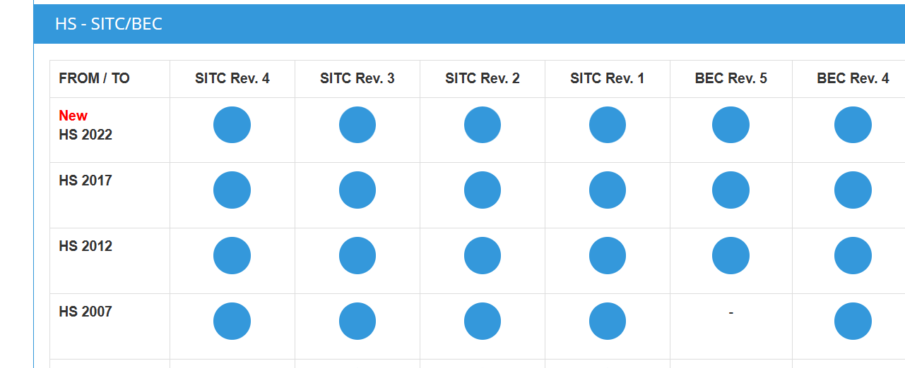 直接给出在哪里下载对应表 :UNSD --- Classifications on economic statistics 该页面里面各种标准的书面文件都能下载,而且还有各种标准的对应关系表格,以HS2012,HS2017与EBC Rev.5对照表关系为例 :点进去页面之后往下滑就能看到这个表了,2行5列就是HS2017与Rev.5对照表,只需要点击对应蓝色圈圈就能下载下来了。