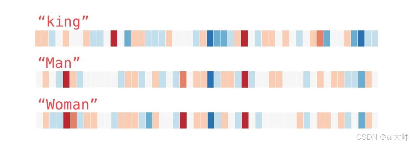 我们忽略数字仅查看颜色,并且将"King"与其他单词进行比较(King 国王、Man 男人、Woman 女人):