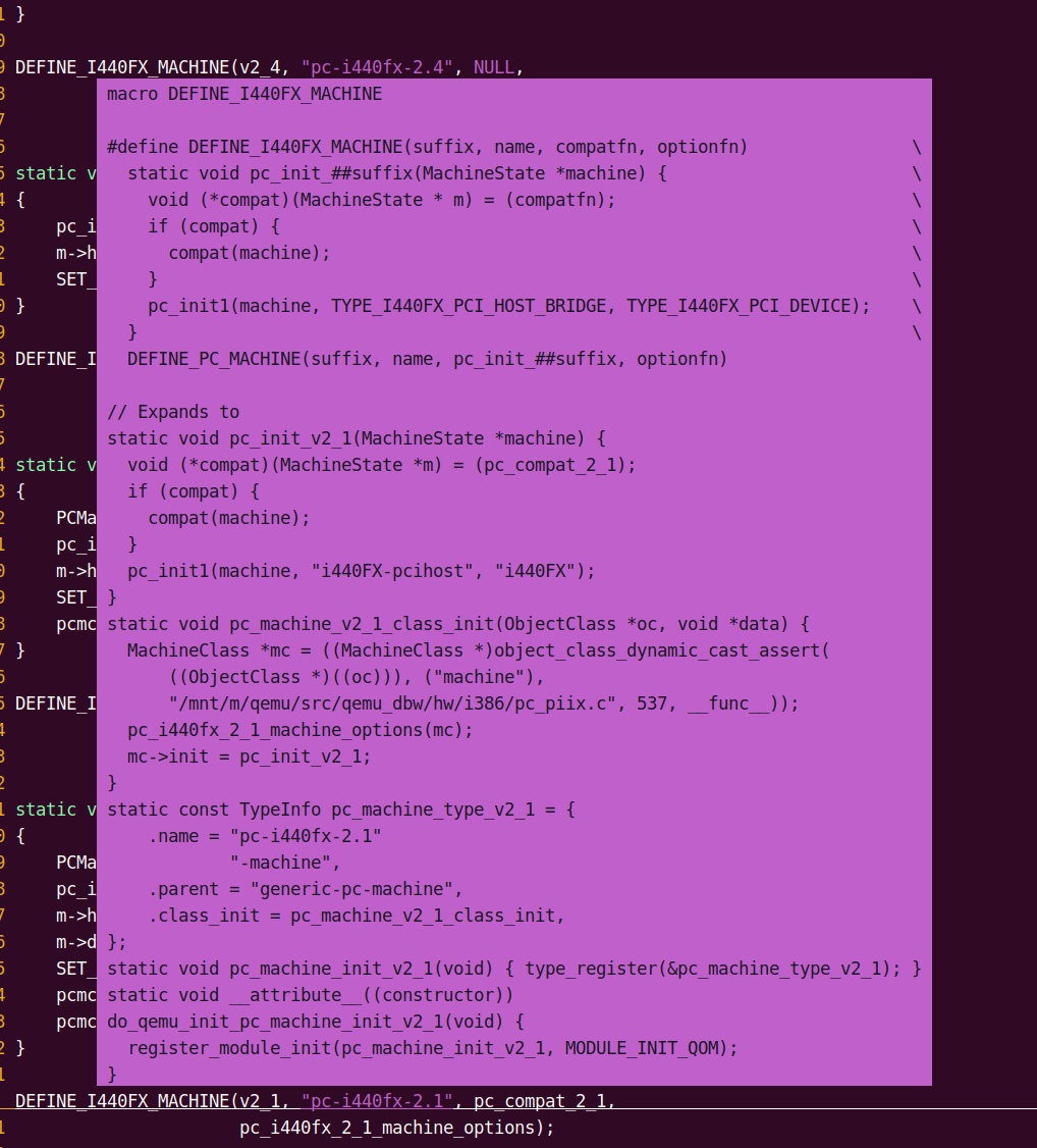 如下图,分析4层嵌套的宏,DEFINE_I440FX_MACHINE -> DEFINE_PC_MACHINE -> type_init -> module_init,只要你的屏幕足够大,就能开足够的窗口,从而一览无余。