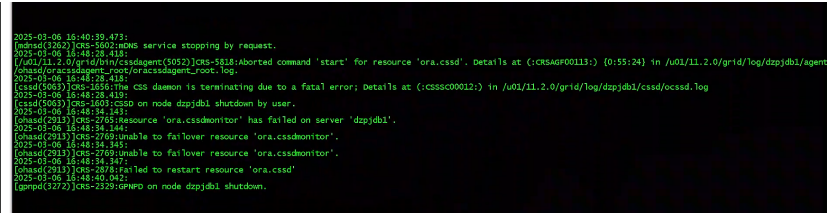 - 首先尝试重启CRS服务并结合$ORACLE_HOME/log/alert.log日志查看