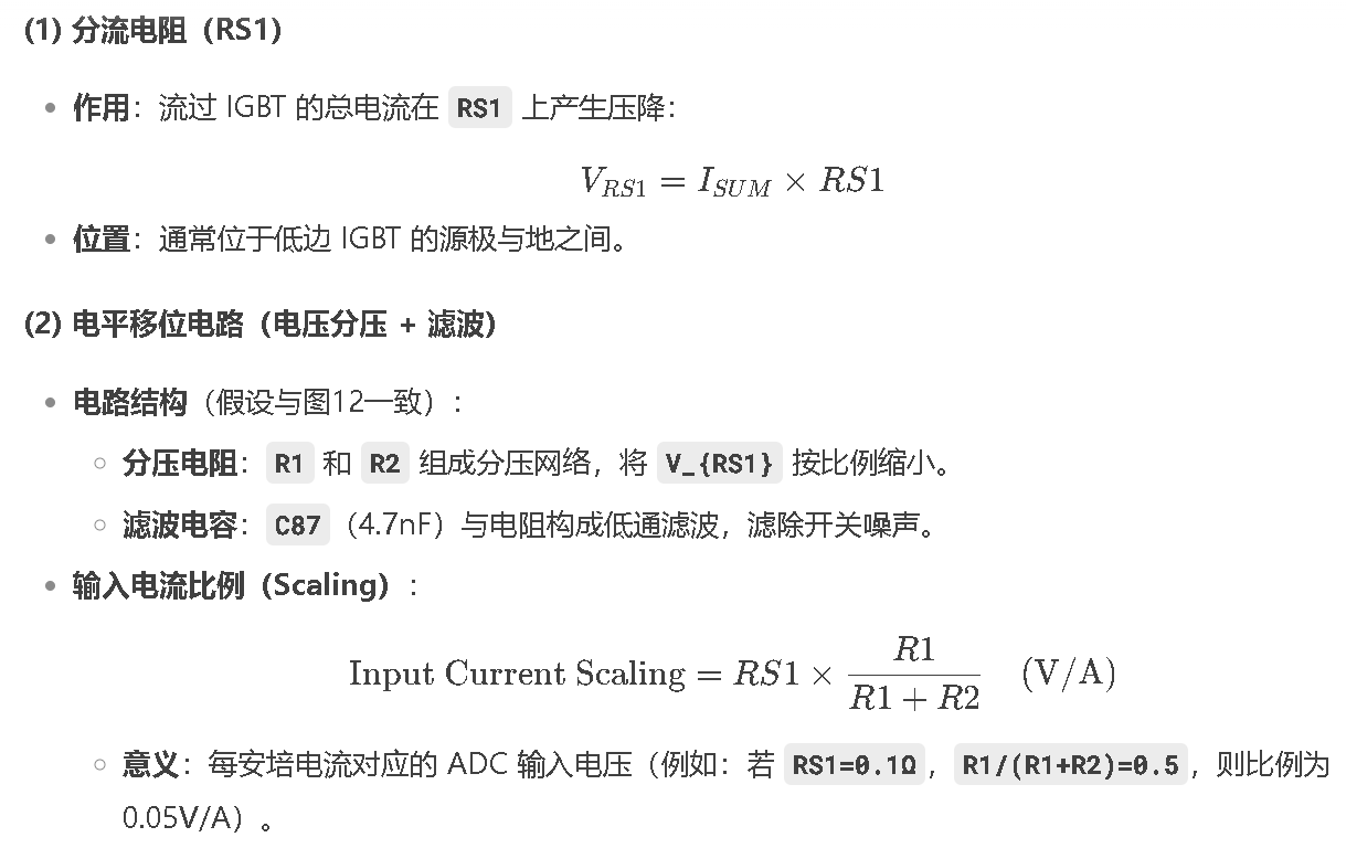 通过单个分流电阻(RS1)检测多路 IGBT 的低边总电流,转换为电压信号后,经电平移位和滤波,送入 MCU 的 ADC 或比较器进行电流监控和过流保护。