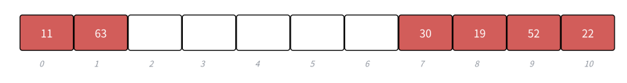 • h ( key ) = hash 0 = key % M , hash0位置冲突了,则线性探测公式为:hc ( key , i ) = hashi = ( hash 0 + i ) % M , i = {1, 2, 3, ..., M − 1},因为负载因⼦⼩于1,则最多探测M-1次,⼀定能找到⼀个存储key的位置。
