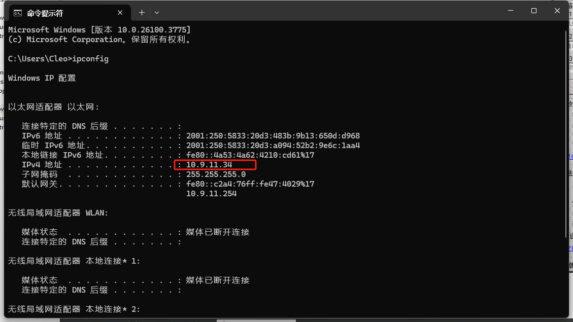 1、终端输入ipconfig查看本机网卡的ipv4地址