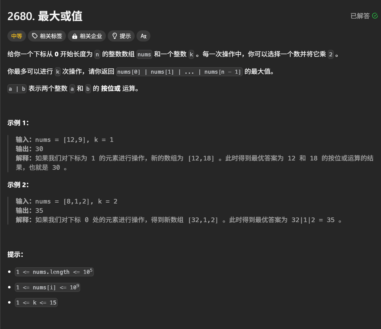 1.计算初始或值:首先计算数组中所有元素的按位或结果 allOr,这表示在不进行任何左移操作时数组的或值。