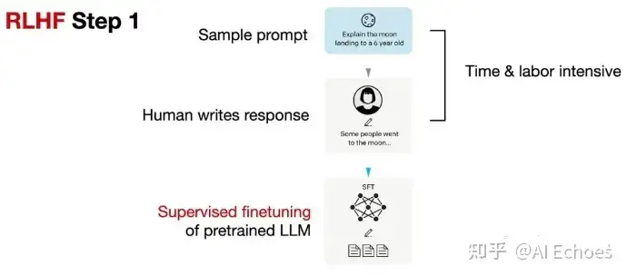 先收集一个Prompts集合,并要求标注人员写出高质量的回复,然后使用该数据集以监督的方式微调预训练的基础模型。