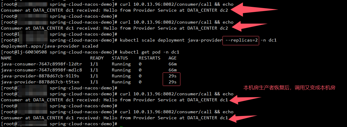 将dc1机房的生产者重新上线后,dc1的消费者从拉远调用 转变成本机房调用 。