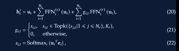 其中 N 5 N_{5} N5 和 N r N_{r} Nr 分别表示共享专家和路由专家的数量; F F N i ( s ) ( ⋅ ) FFN_{i}^{(s)}(\cdot) FFNi(s)(⋅) 和 F F N i ( r ) ( ⋅ ) FFN_{i}^{(r)}(\cdot) FFNi(r)(⋅) 分别表示第 i 个共享专家和第 i 个路由专家; K 1 K_{1} K1 表示已激活的路由专家数量; g i , t g_{i, t} gi,t 是第 i 个专家的门值; s i , t s_{i, t} si,t 是 tokento-expert 的亲和力; e i e_{i} ei 是该层中第 i 个路由专家的质心;Topk ( ⋅ , K ) (\cdot, K) (⋅,K) 表示在为第 t 个标记和所有路由的 EA 计算的亲和力分数中包含 K 个最高分数的集合。