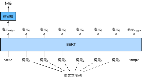 这一节我们将利用15.6节学习的新知识对15.5的任务中BERT模型进行微调,为了简便,采用15.6中简单的多层感知机模型。