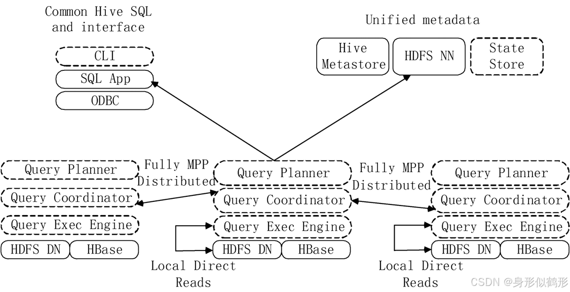 | Impalad | 是 Impala 的进程,负责协调客户端提交查询的执行、给其他 Impalad 分配任务、汇总其他 Impalad 的执行结果,还能执行其他 Impalad 分配的任务,对本地 HDFS 和 HBase 里的部分数据进行操作 | 包含 Query Planner、Query Coordinator 和 Query Exec Engine 3 个模块;与 HDFS 的数据节点(HDFS DN)运行在同一节点上,基于 MPP 架构完全分布式运行 |