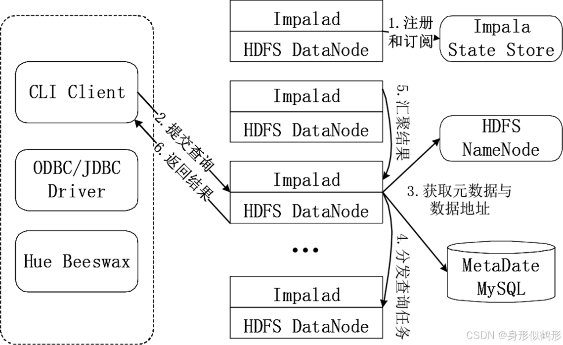 | 第 1 步:注册和订阅 | Impalad 进程向 State Store 提交注册订阅信息,State Store 的 statestored 进程处理注册订阅 | 当用户提交查询前,创建 Impalad 进程负责协调客户端查询;State Store 创建 statestored 进程,通过多个线程处理 Impalad 的注册订阅信息 |