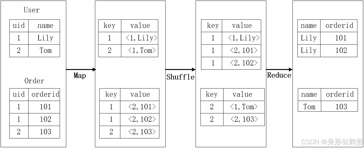 在Map阶段,表 user 中记录 (uid, name) 映射为键值对 (uid, <1, name>),表 order 中记录 (uid, orderid) 映射为键值对 (uid, <2, orderid >),其中 1,2 是表 user 和 order 的标记位。