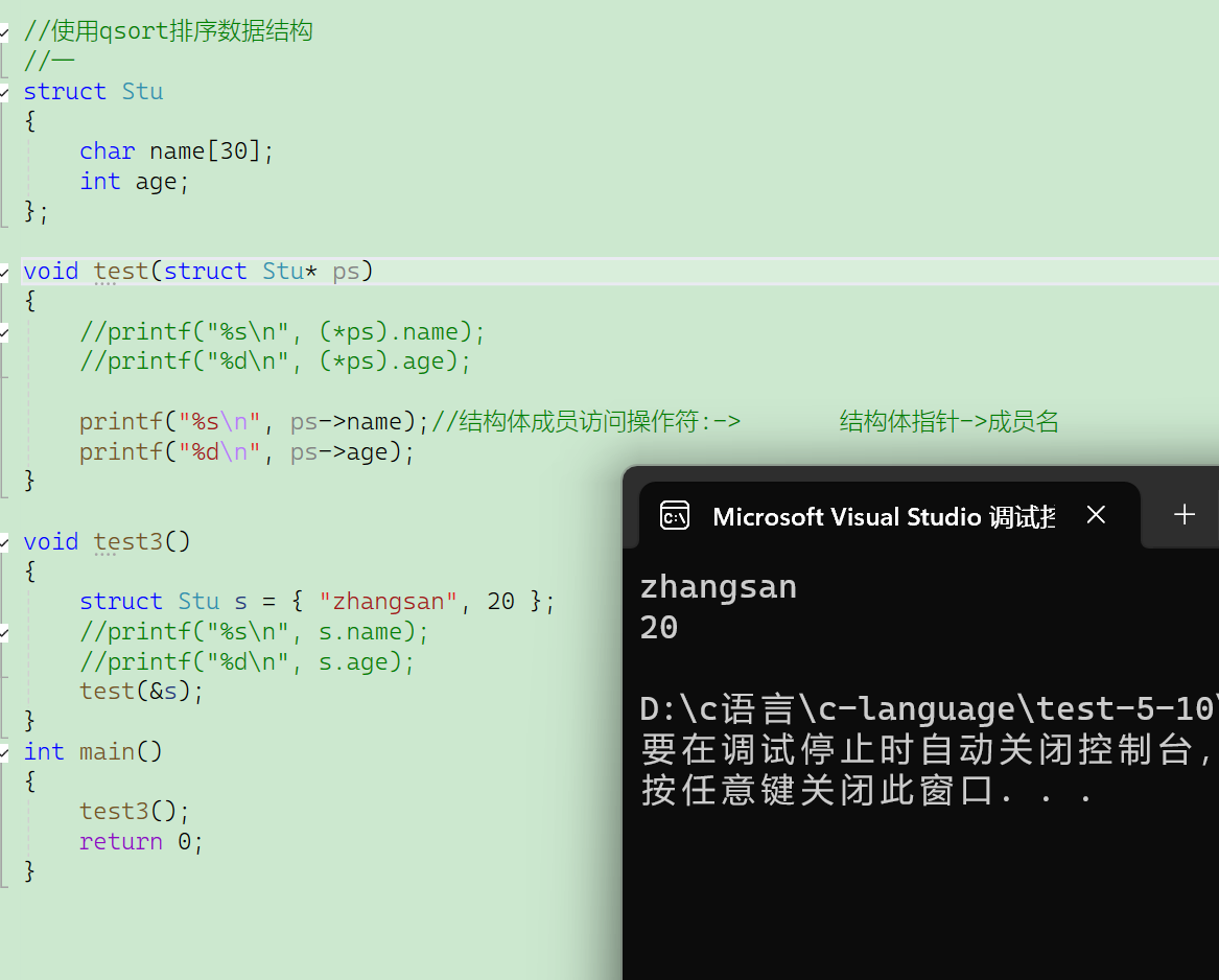 //printf("%d\n", (*ps).age);printf("%s\n", ps->name);//结构体成员访问操作符:-> 结构体指针->成员名