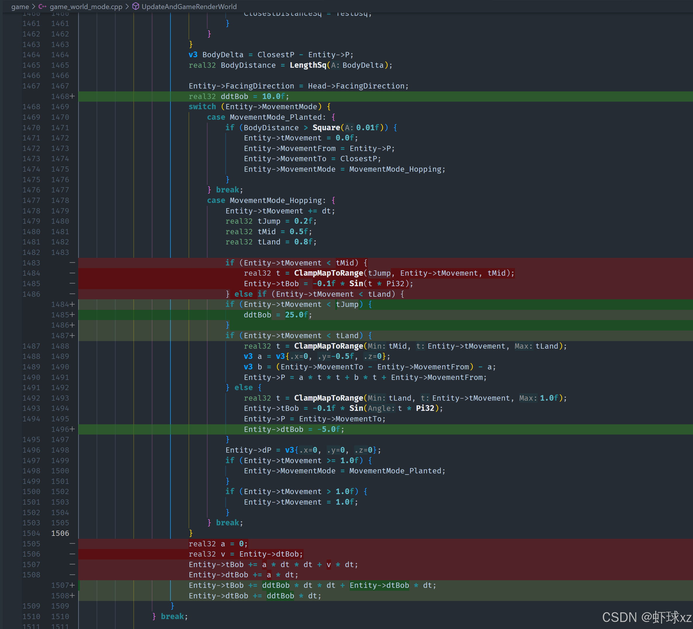 为了实现这一点,我们将原本受跳跃模式控制的 T_Bob 计算部分移除,并提取出来放入一个始终进行的物理模拟系统中。这意味着 T_Bob 不再受具体跳跃阶段的影响,而是始终根据物理规则进行更新。虽然以后依然可以根据需要在某些特殊模式下覆盖其行为,但默认行为将是基于模拟的。