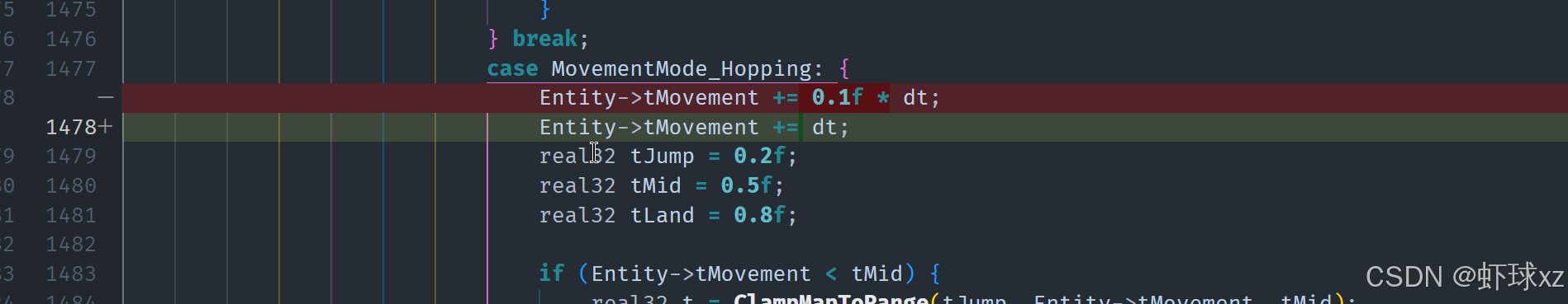 我们现在开始引入一个非常直接的机制:通过构建一个弹簧系统来模拟 t_bob(一个代表角色身体弹动的值)。为此,我们增加了 dt_bob 变量,表示 t_bob 的一阶导数,即"速度"。t_bob 表示位置,dt_bob 表示速度,这构成了最基本的物理运动建模框架。