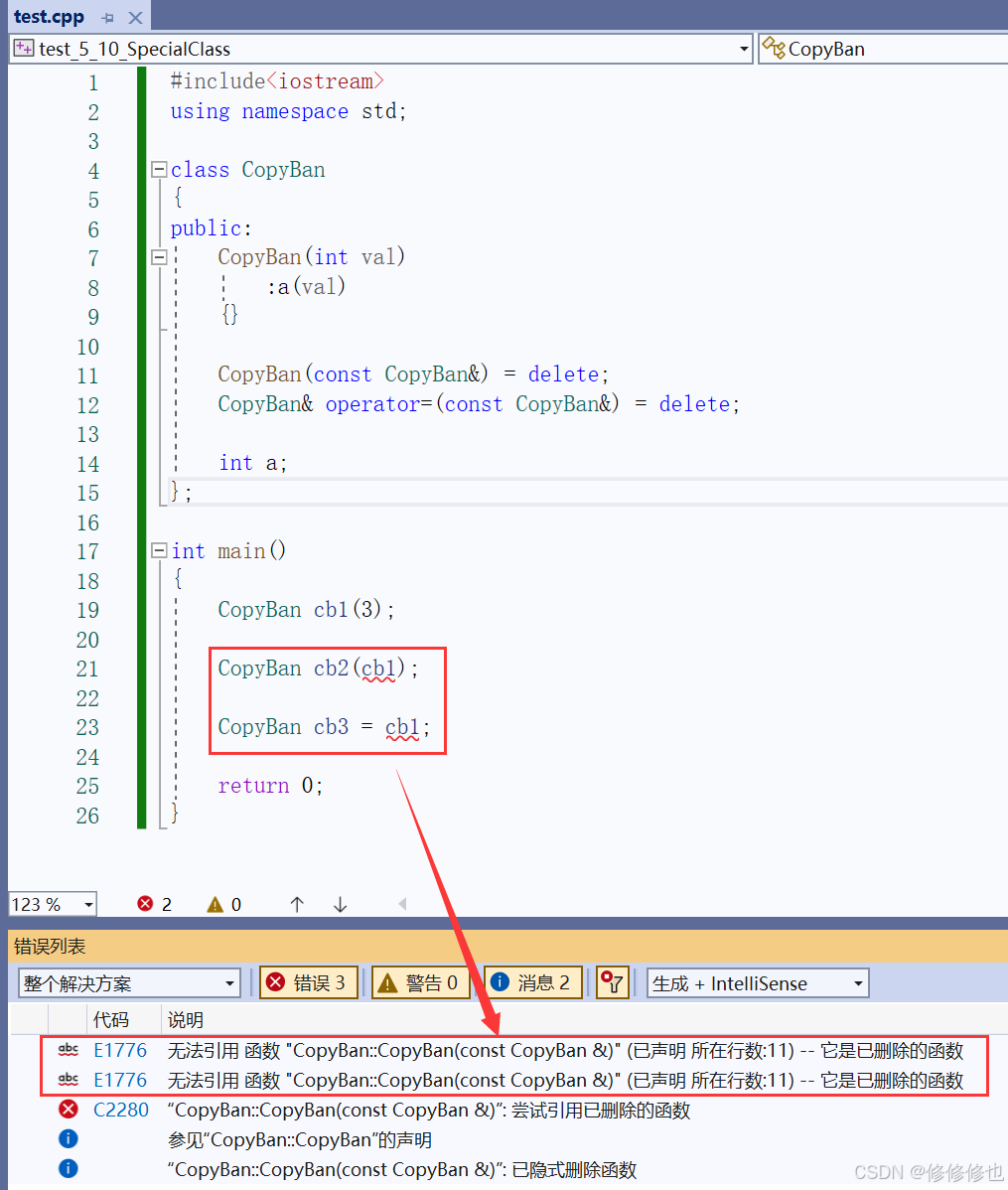 cppclass CopyBan { public: CopyBan(int val) :a(val) {} CopyBan(const CopyBan&) = delete; CopyBan& operator=(const CopyBan&) = delete; int a; };测试结果: 可以看到删除后该类同样无法进行拷贝了