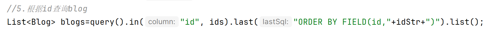 List<Shop> shops = query().in("id", ids).last("ORDER BY FIELD(id," + idStr + ")").list();