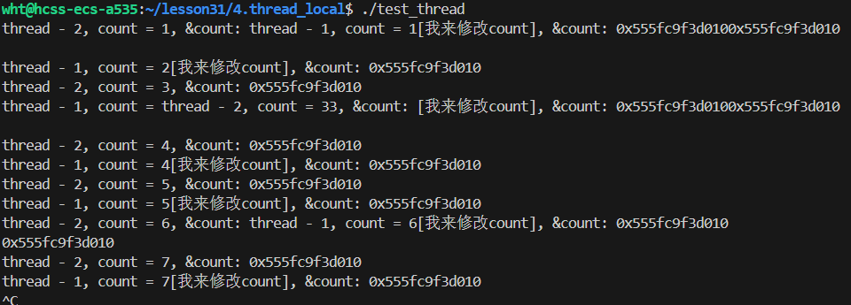 与上面不同的是,在添加__thread后,线程1修改count,线程2读取的count不再随着线程1 的修改而修改