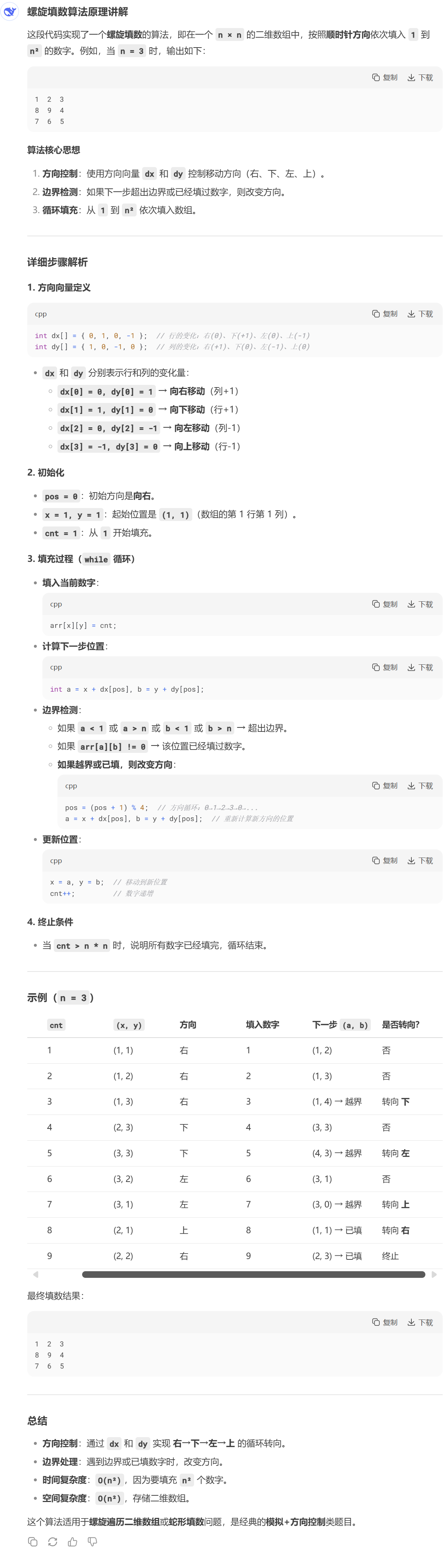 从左上角填上 1 1 1 开始,顺时针方向 依次填入数字,如同样例所示。注意每个数字有都会占用 3 3 3 个字符,前面使用空格补齐。