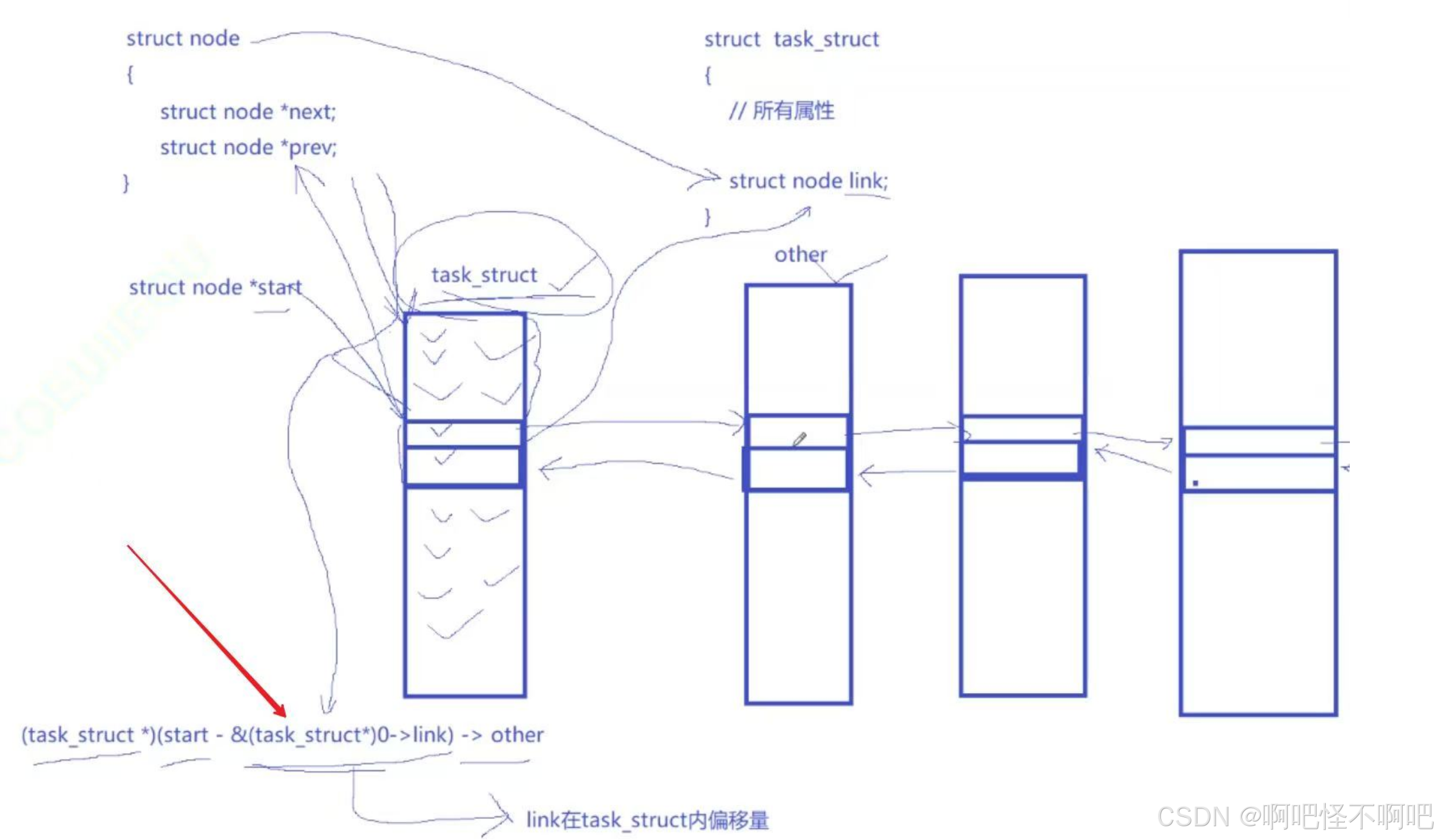 我们来看下面这张图片里面的红色箭头指向的那个式子,我们就是通过改变那个start来实现遍历访问的,在这个公式里面,链表操作只知道 struct node *start,不知道这是哪一个 task_struct 的 link 成员(task_struct *)0 是构造一个假地址为 0 的指针,它的 ->link 的地址就代表偏移量本质就是start 是一个 struct node *,而不是 task_struct *,**根本没 other 这个字段!**必须先转换回 task_struct* 才能访问它的其他成员。