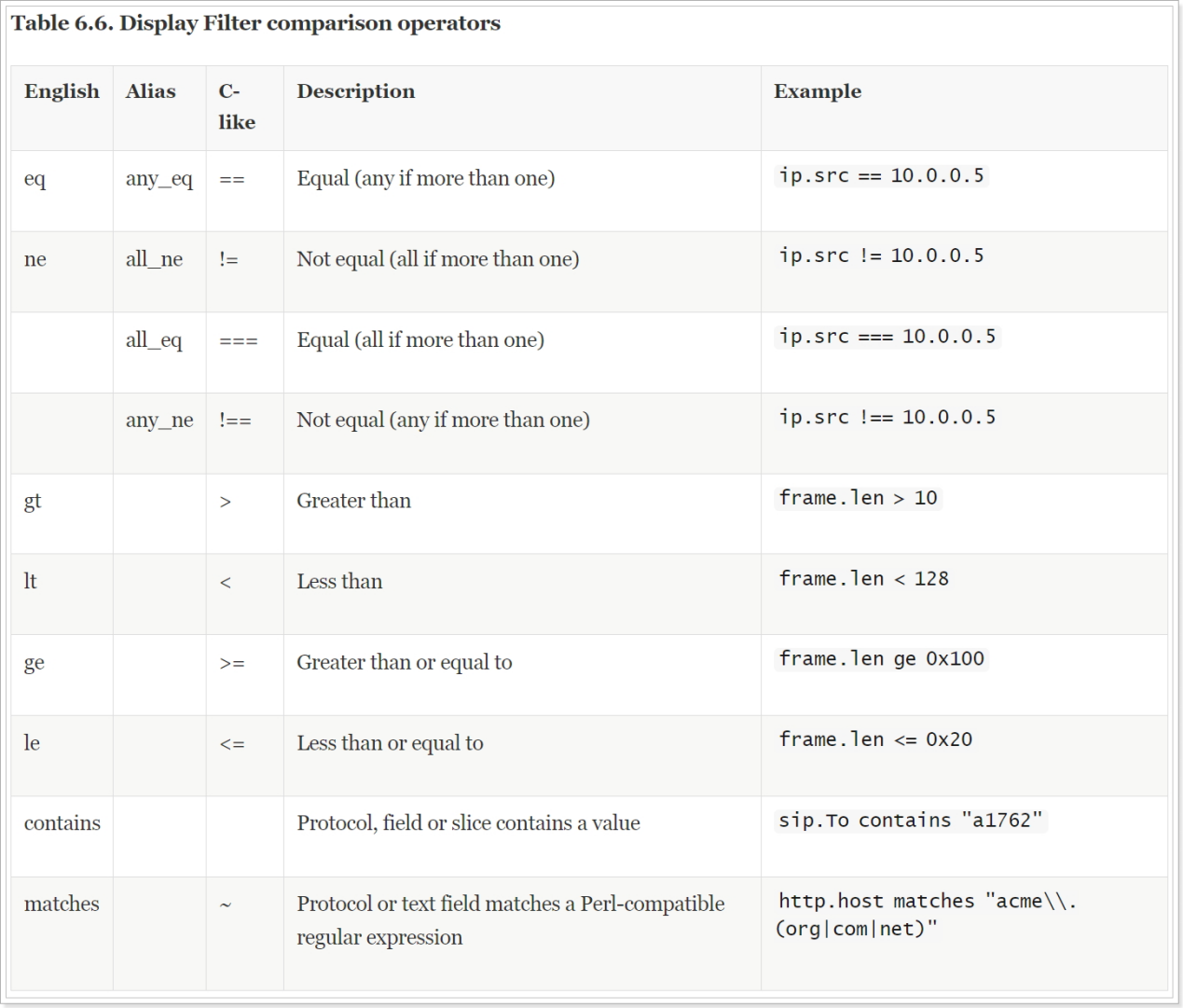 过滤关系是过滤项和过滤值的关系,wireshark的帮助文档中有过滤关系的相关符号,如下: