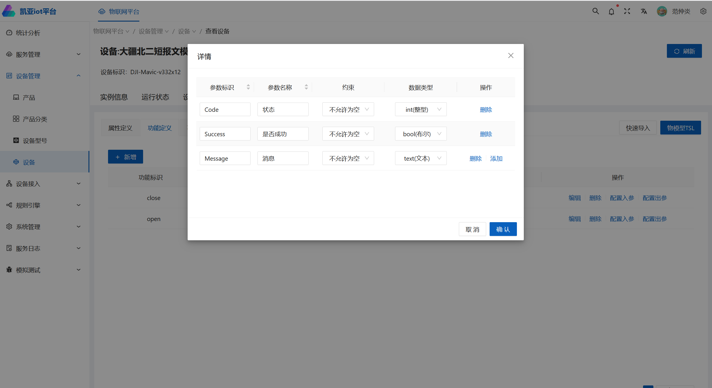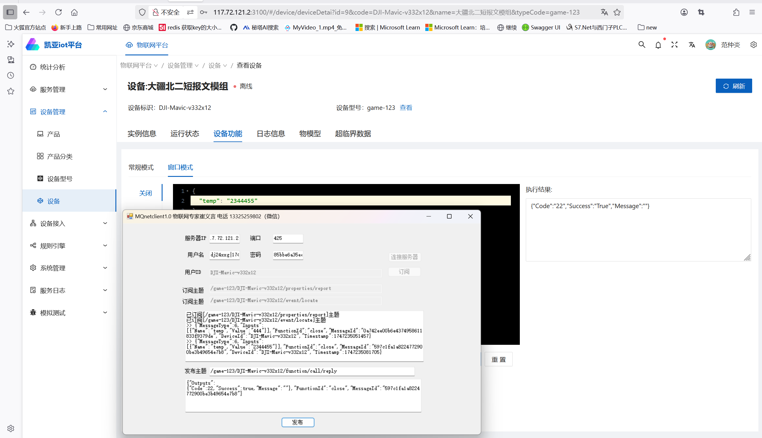 点击执行后,在MQTT客户端会接收一条消息,然后对于该命令消息进行回复通知服务端,表示设备已经执行, 对于消息回复需要发布主题为 /game-123/DJI-Mavic-v332x12/function/call/reply的消息,消息内容为