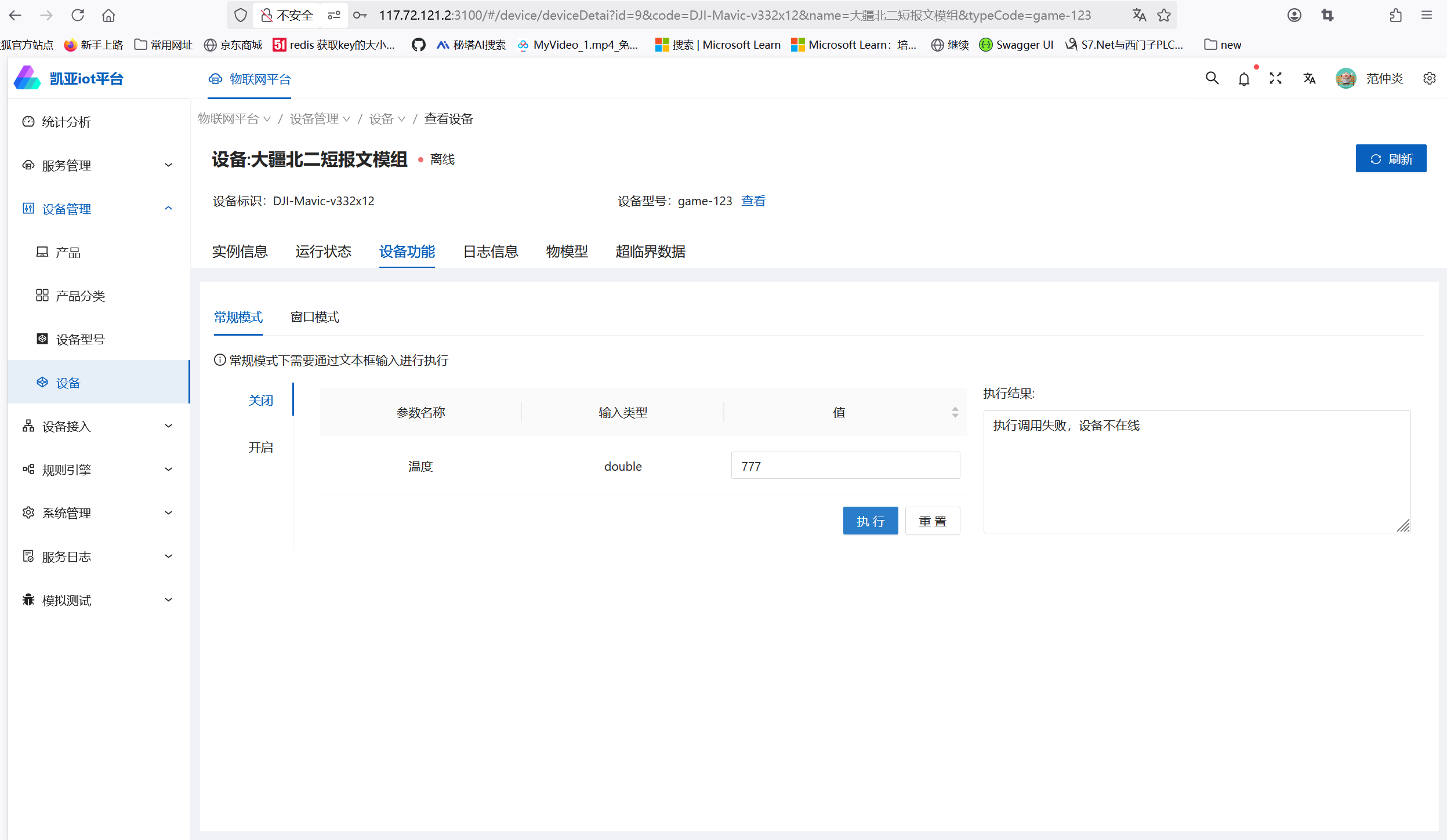 设备功能包括常规模式和窗口模式, 常规模式是文本框输入进行提交执行,窗口模式是json 提交执行,如果没有设备连接,点击执行会提示设备未在线