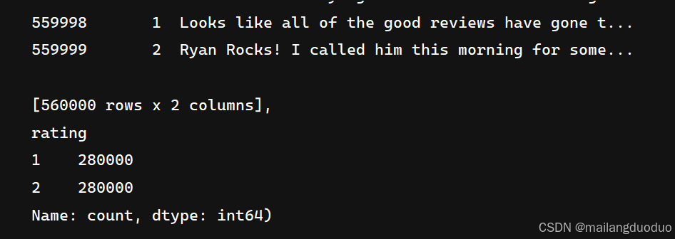 本项目数据集来源:2015年,Yelp 举办了一场竞赛,要求参与者根据点评预测一家餐厅的评级。该数据集分为 56 万个训练样本和3.8万个测试样本。共计两个类别,分别代表该评价属于积极还是消极。这里以训练集为例,进行介绍展示: