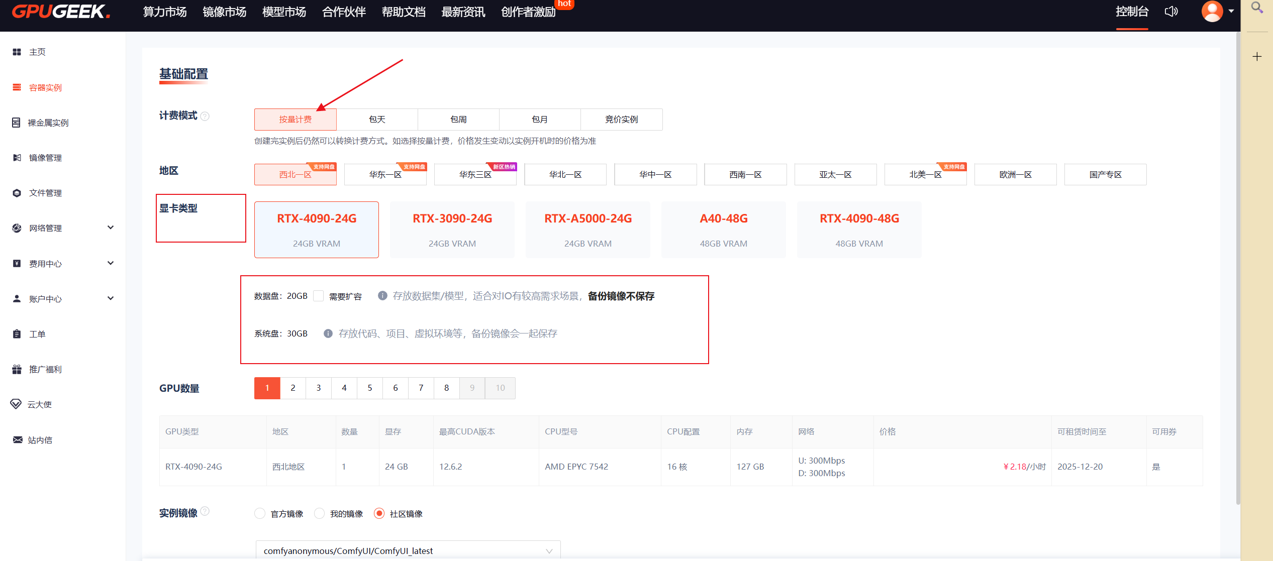按需使用资源不会造成资源的浪费,显卡选择RTX-4090-24G,数据盘和系统盘默认即可,GPU数量选择1就好。