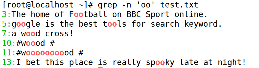在上述结果中,"wood"字符串"w..d"匹配规则。若想要査询 oo、ooo、ooooo 等资料,则需要使用星号(*)元字符。但需要注意的是,"*"代表的是重复零个或多个前面的单字符。"o*"表示拥有零个(即为空字符)或大于等于一个"o"的字符,因为允许空字符,所以执行"grep-n'o*' test.txt"命令会将文本中所有的内容都输出打印。如果是"oo*",则第一个 。必须存在,第二个 o 则是零个或多个 。,所以凡是包含 o、oo、ooo、ooo,等的资料都符合标准。同理,若查询包含至少两个 。 以上的字符串,则执行"grep -n'ooo*' test.txt"命令即可。