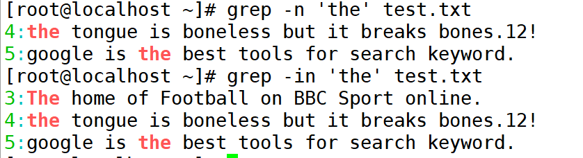 查找特定字符非常简单,如执行以下命令即可从测试文件中查找出特定字符"the"所在位置。其中"-n"表示显示行号、"-ì"表示不区分大小写。命令执行后,符合匹配标准的字符,字体颜色会变为红色。