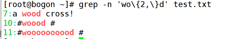 在上述命令的执行结果中发现"woood"与"wooooood"也符合匹配规则,二者均包含"w"。其实通过执于结果就可以看出,符合匹配标准的字符加粗显示,而上述结果中可以得知,"#woood #"中加粗显示的是"o0o",而"o0"前面的"。"是符合匹配规则的。同理"#woooooood #"也符合匹配规则。