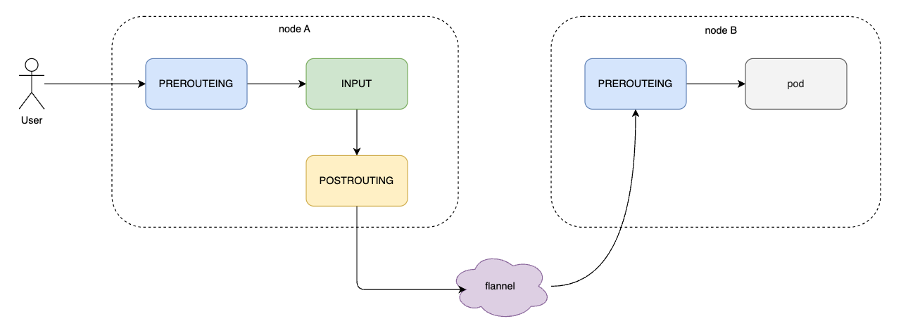kube-proxy 通过在 INPUT,FORWARD,POST_ROUTING 链上添加钩子规则实现 Service 的负载均衡和反向代理。示意图如下: