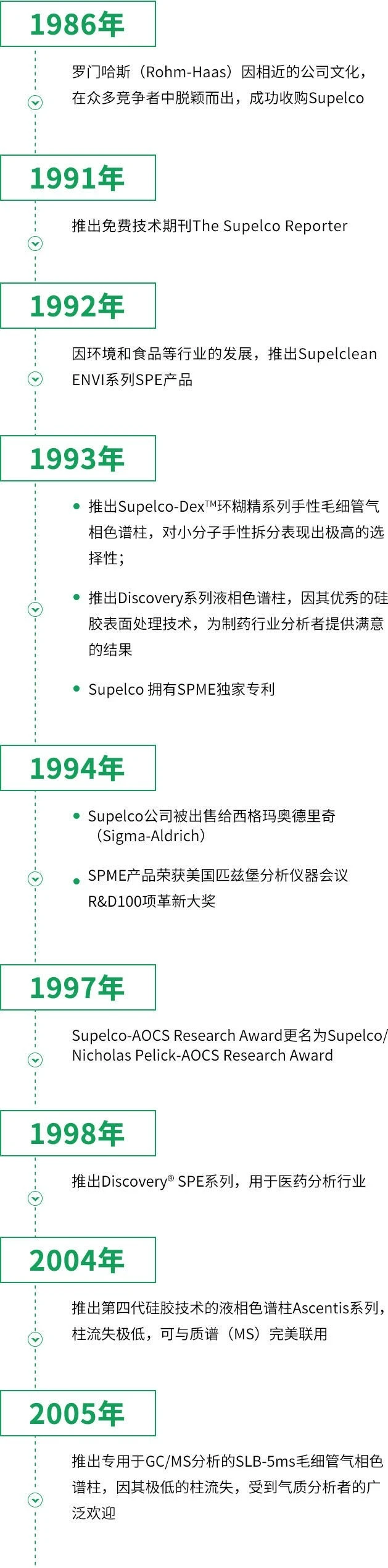 目前,默克旗下品牌Supelco®包括众多分析产品,如高品质的溶剂、种类丰富的前处理产品、性价比超高的气液相色谱柱、性能优异的薄层层析板和满足法规要求的标准品等,给新老客户提供最完整的分析耗材产品: