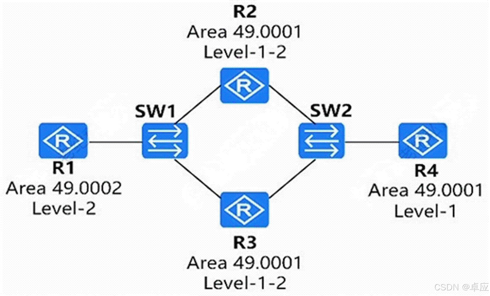 - 四台路由器运行IS-IS且已经建立邻接关系,区域号和路由器的等级如图中标记,下列说法中正确的有?