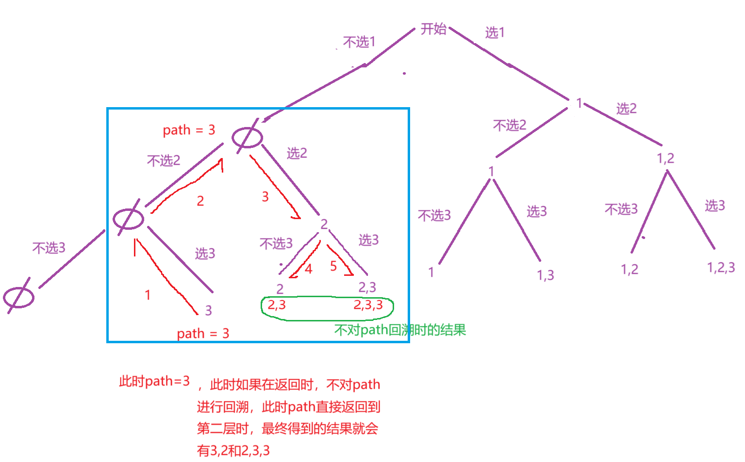 函数体的设计:根据上面的分析,遍历到策略树的每一层时,会有2中情况。第一种情况:如果我们选择这个数字,我们就要将这个数字尾插到path中(path.add(nums[index])), 尾插完这个数字后,还要递归到下一层。第二种情况:如果我们不选择这个数字,直接递归到下一层即可,不过,此时要进行回溯,因为path是随时在改变的,所以每次返回时,我们都要将path还原成原来的样子,否则就会出现下图篮框的情况。