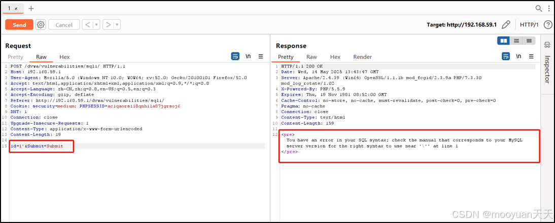 由于报文中的参数id是通过POST传入,接下来我们通过burpsuite来进行渗透,将报文发送到bp,如下所示。
